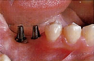 歯が欠損した時、通常は両隣の歯を利用してブリッジにするか、義歯を入れますが、 図のようにインプラント(人工歯根)を用いて処置することも出来ます。